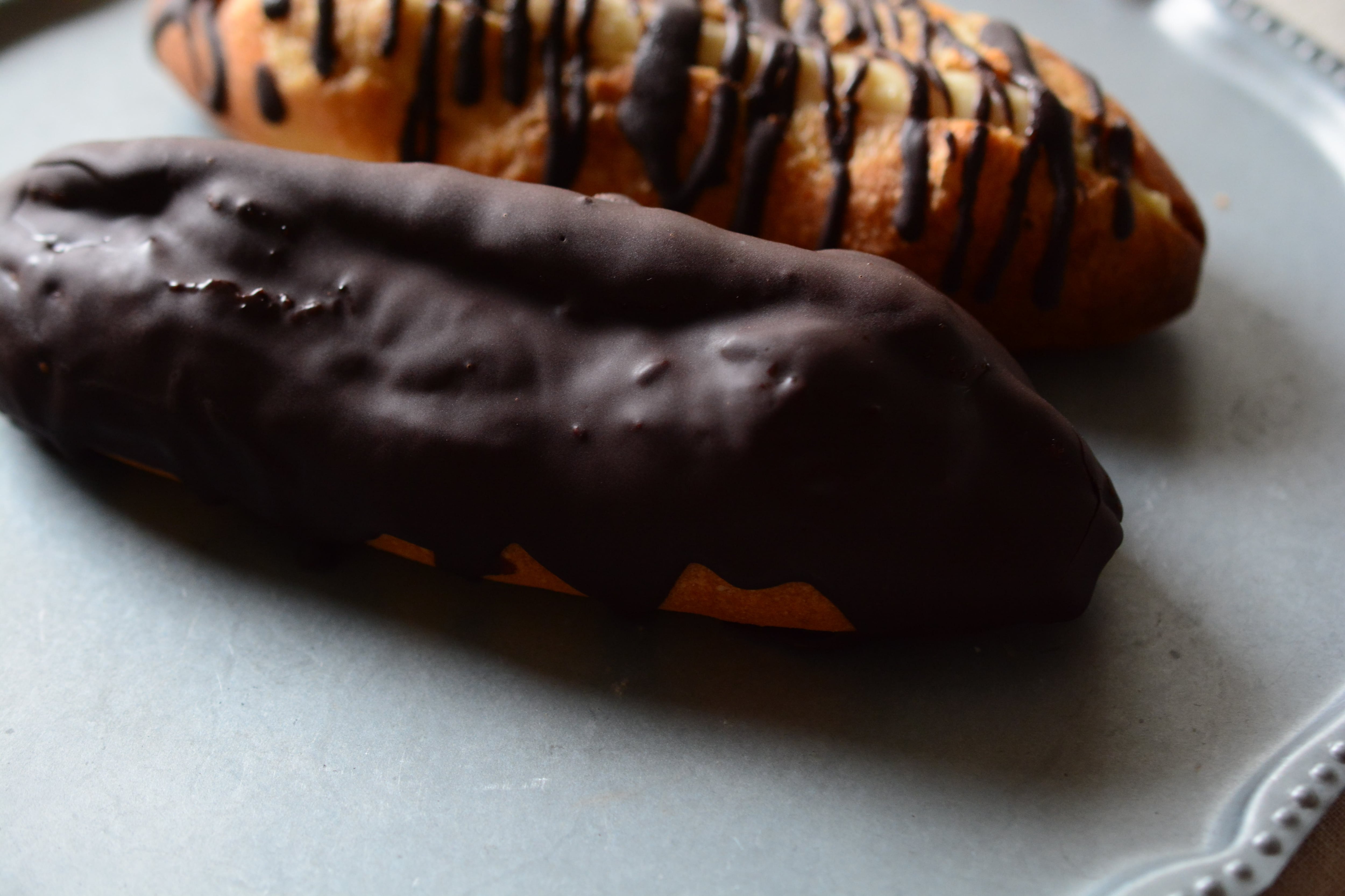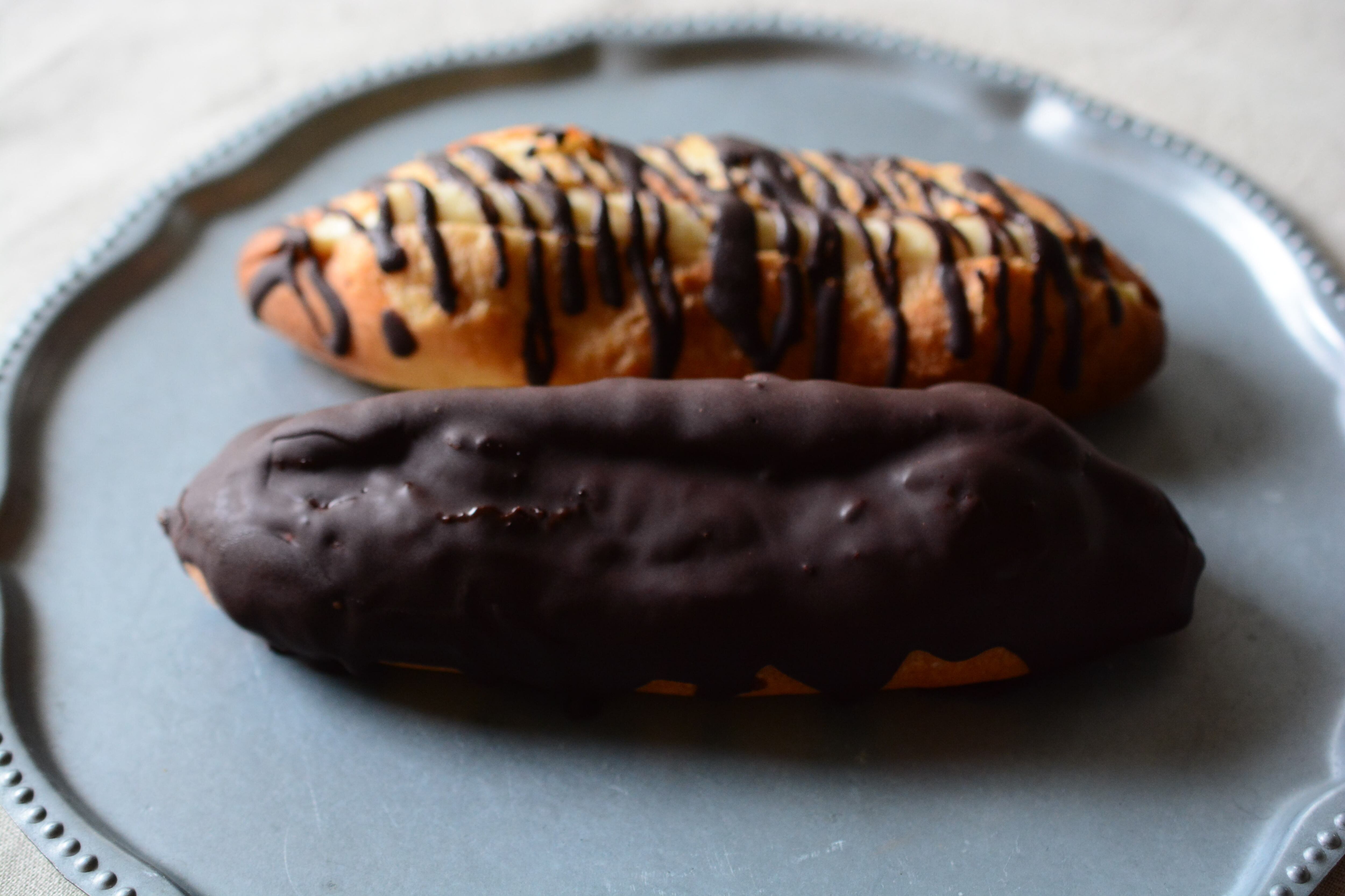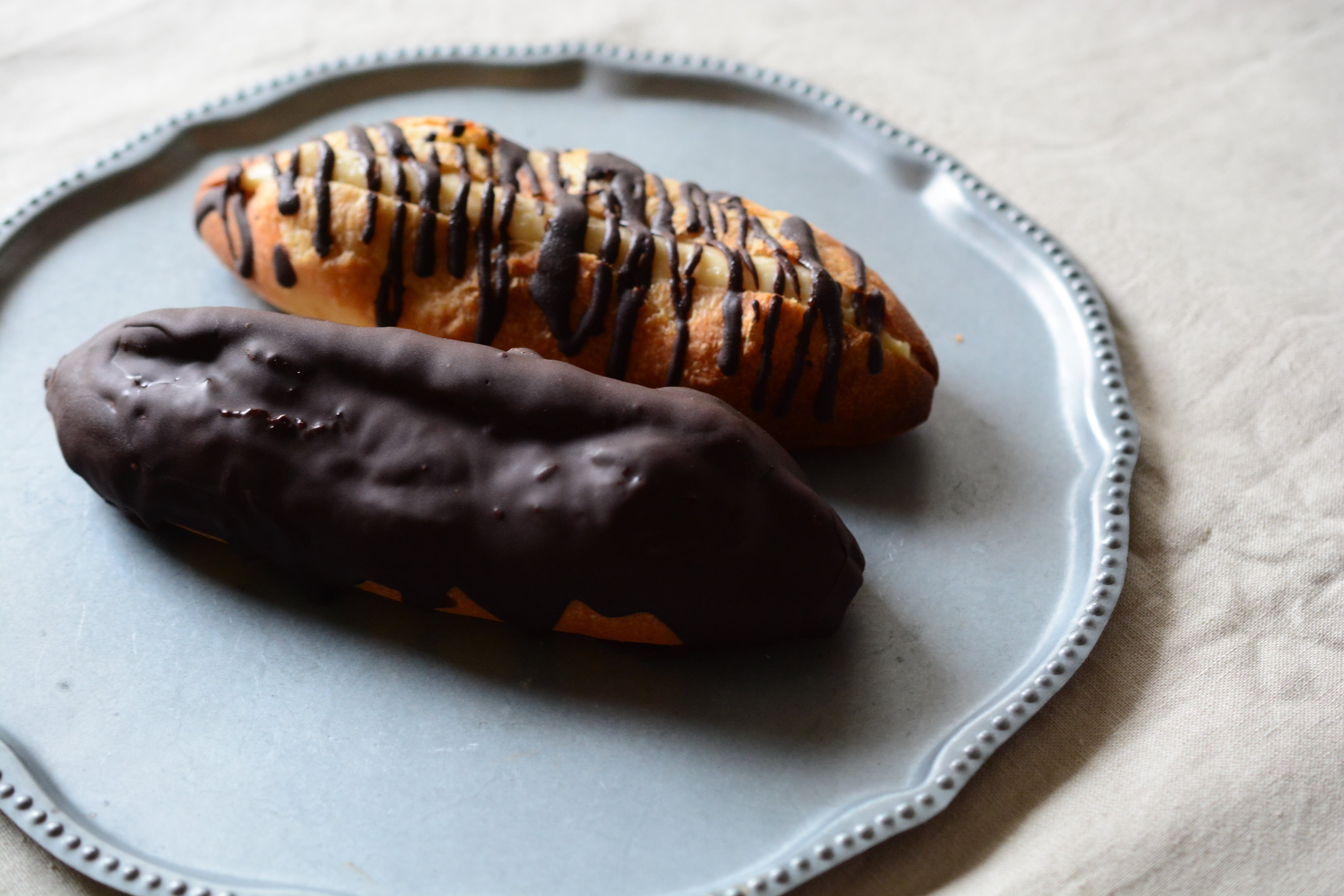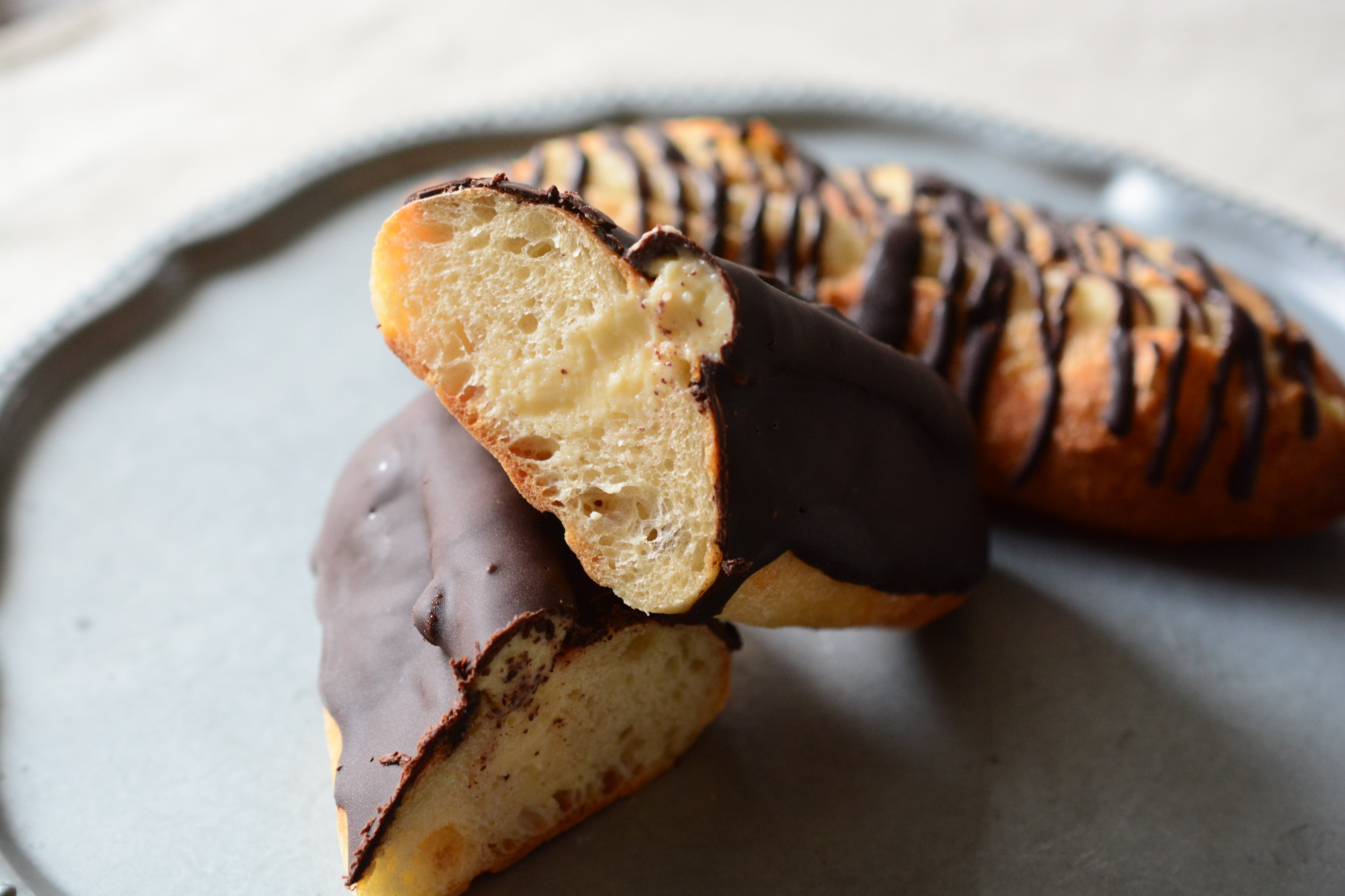 パン屋がエクレアを作ったら?!をテーマにハード系のパンにカスタードを挟んでチョコレートでコーティングしました。